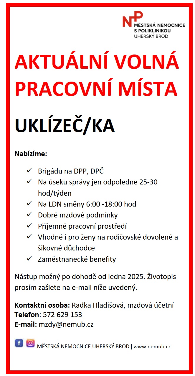 Dětská pohotovost bude během měsíce ledna uzavřena, důvodem je nedostatek lékařů. O únorovém zajištění služeb se jedná. Nejbližší pohotovost bude i nadále zajišťována v Uherskohradišťské nemocnici. Děkujeme za pochopení.