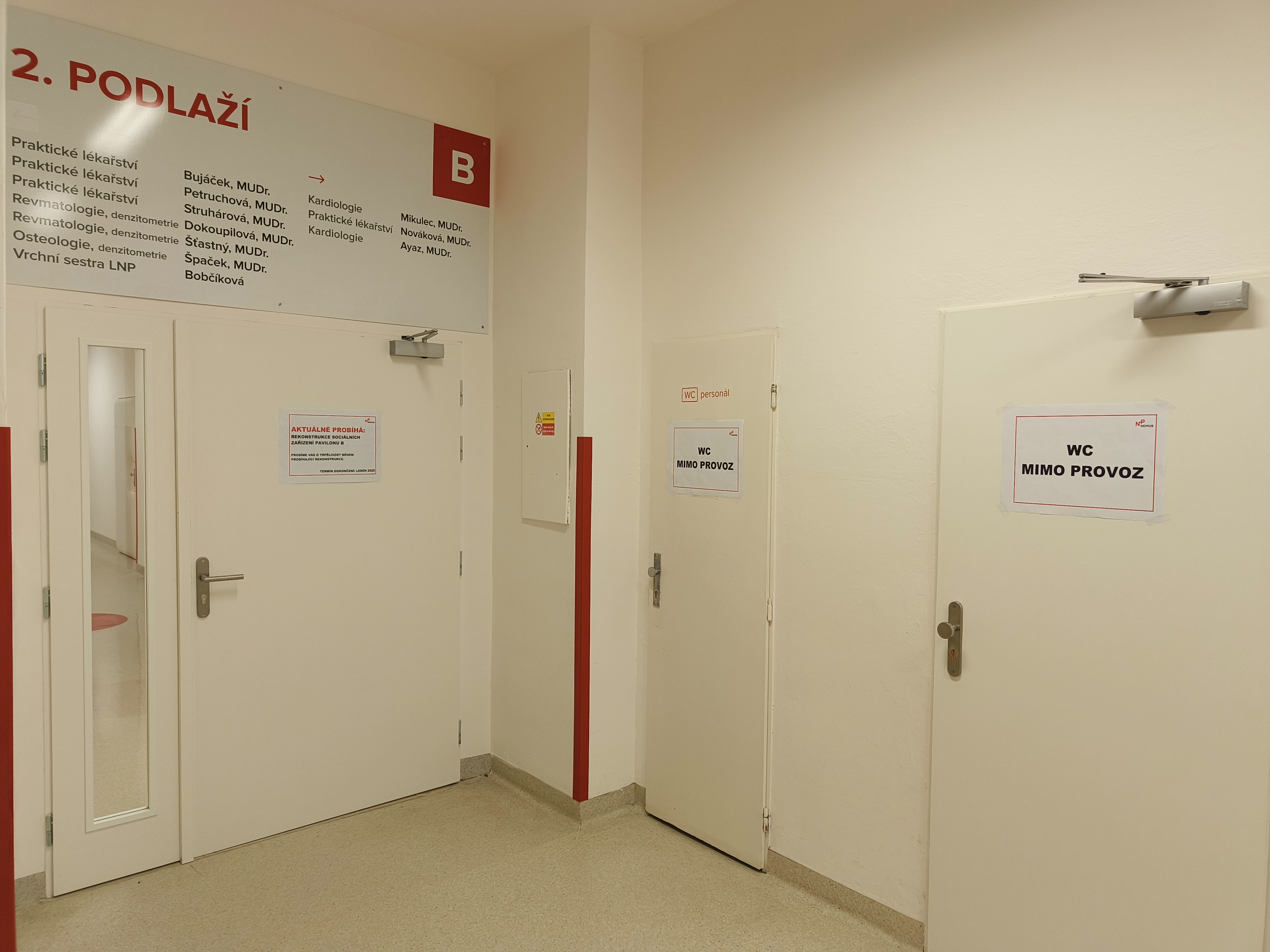 Tento týden se zahájí naplánovaná rekonstrukce sociálních zařízení jak pro veřejnost, tak i personál, které se nachází v 1. a 2. nadzemním podlaží pavilonu B. Tyto prostory budou modernizovány a po provedení stavebních úprav budou sloužit opět jako sociální zařízení. Náhradní WC jsou k dispozici v pavilonu C (1.-4. NP), do kterého se dostanete spojovacím krčkem, event. je možnost využít sociální zařízení v pavilonu A1 (1.-2. NP).